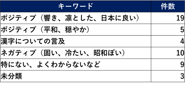 確かに、Geminiの出すカテゴリと同じようなカテゴリとなりましたが、「ポジティブ(平和、穏やか)」は5件、「漢字についての言及」は4件とそう多くはないので、これは独立したカテゴリにせずとも他の分類に入れてもよかったかもしれません。